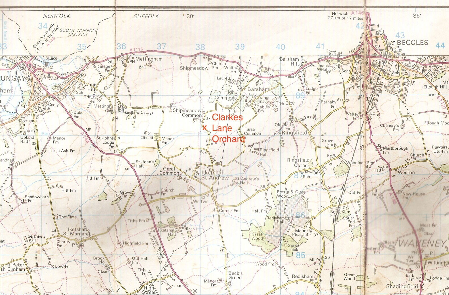 Postcode NR34 8HR, (map ref. 381 882) There will be signs at some junctions of lanes. See copy of the OS map of the area below.